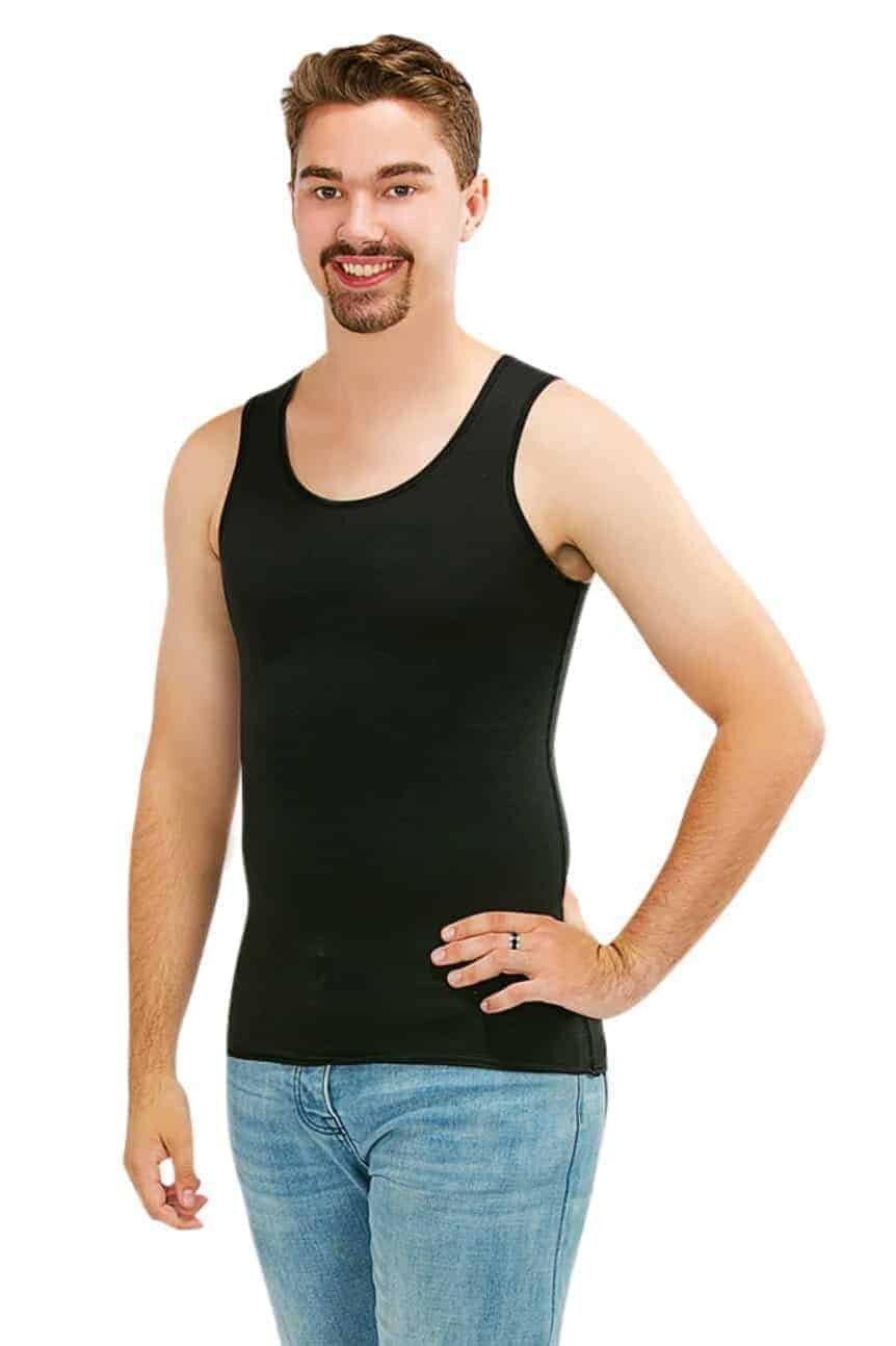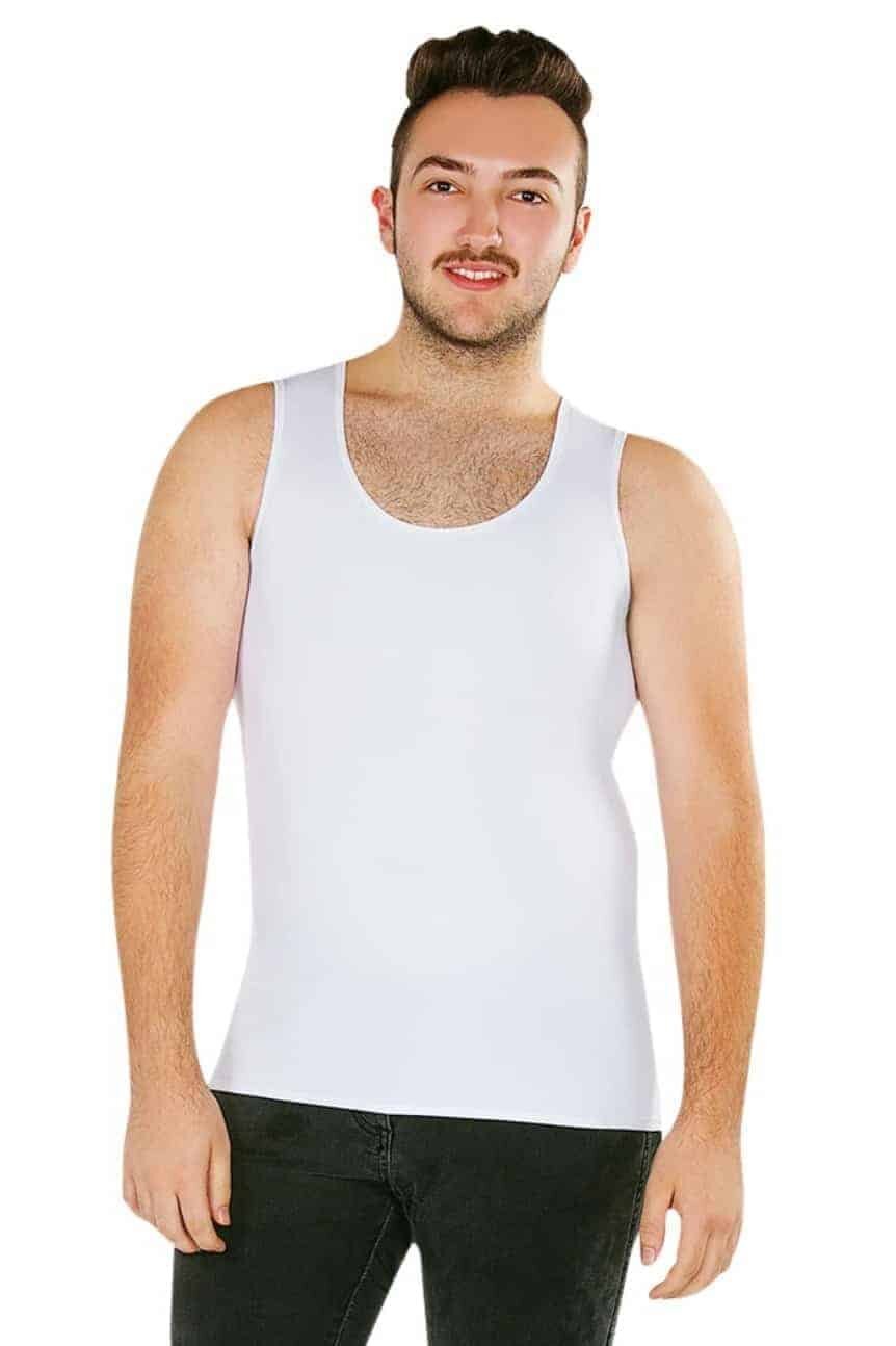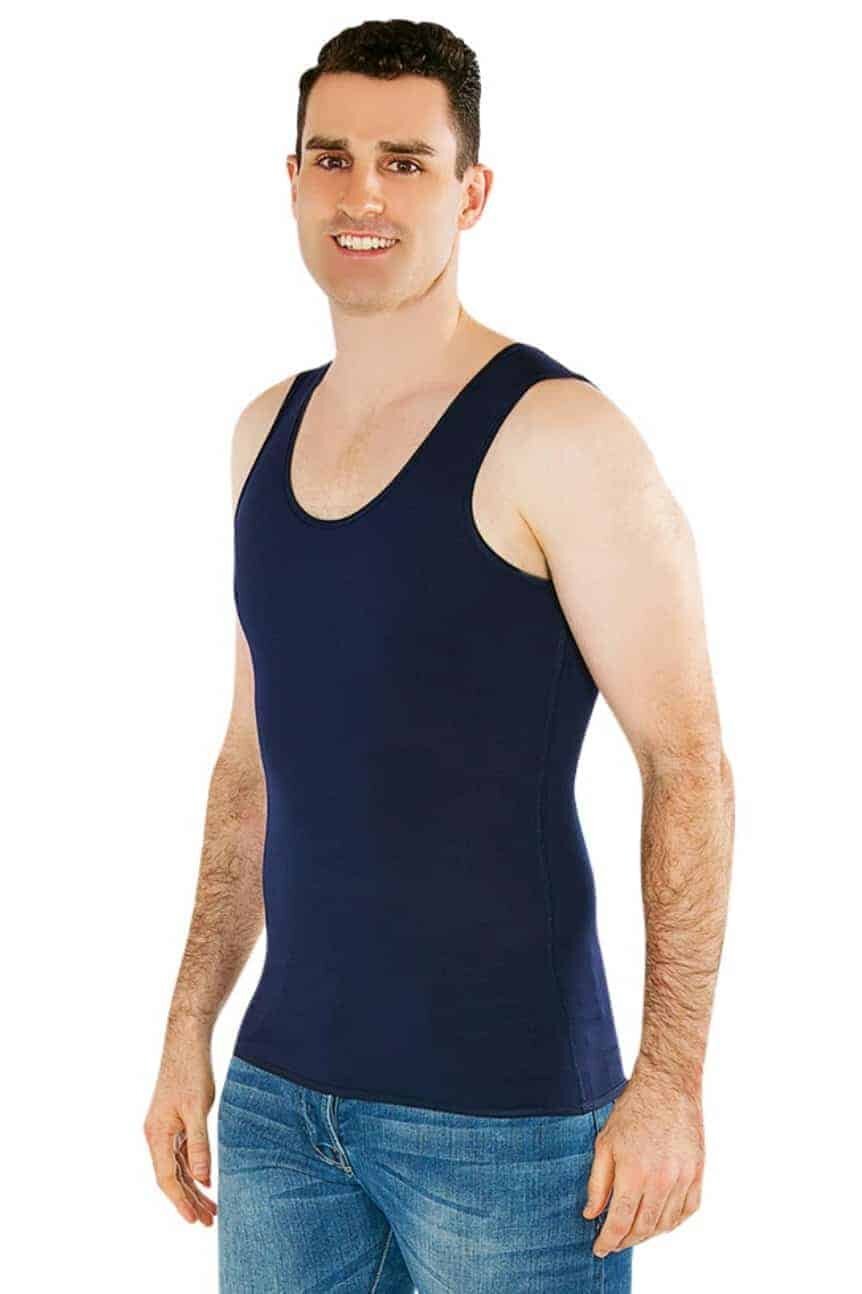 Sensory compression clothing singlet available in black, blue and white.