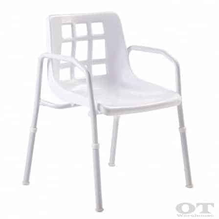 The Care Quip shower chair features a moulded plastic seat with small drain slots and is height adjustable.