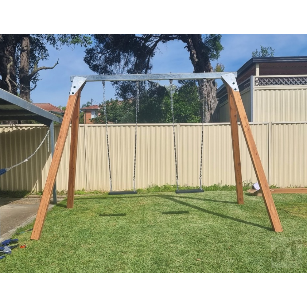 This is a great steel and timber swing set for your backyard. With a commercial grade steel top beam and commercial grade swing hooks this is the best backyard swing set in Oz!