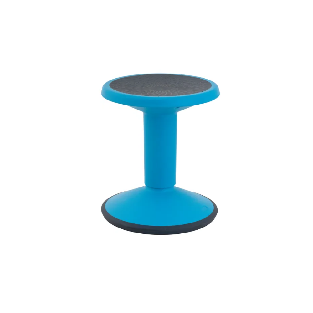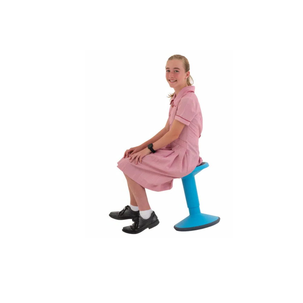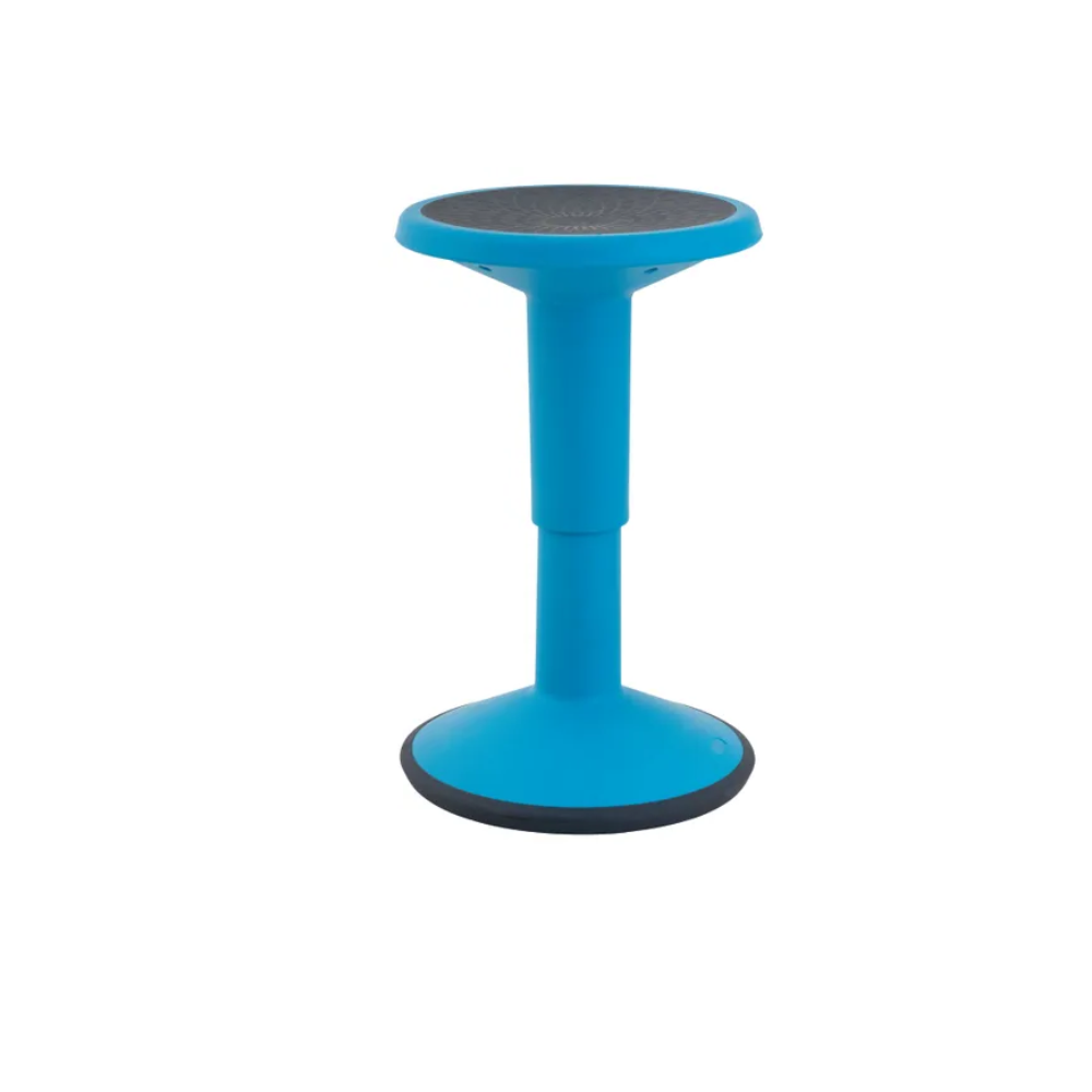The height-adjustable flexi stool in blue features a curved base for movement and a gas-lift adjustment from 40cm to 55cm. Its lightweight design and non-slip base make it ideal for active learning environments, promoting mobility and core strength.