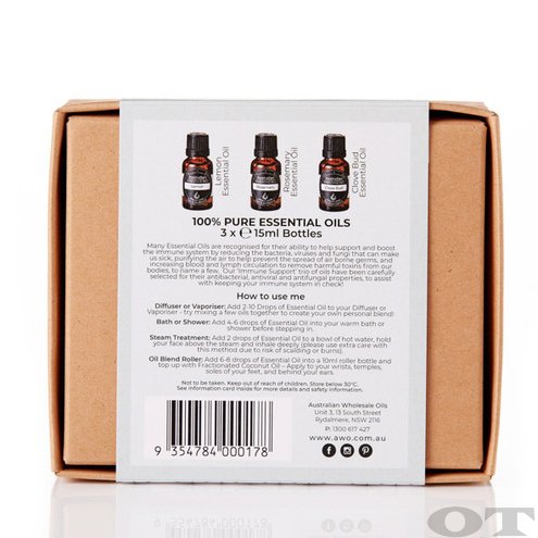 Immune Support contains three 100% pure essential oils that are known to support, protect and boost the immune system, whilst reducing typical cold and flu-like symptoms. When diffused individually or as an essential oil blend, these three oils have been seen to reduce the spread of harmful airborne bacteria, whilst calming the mind and body.