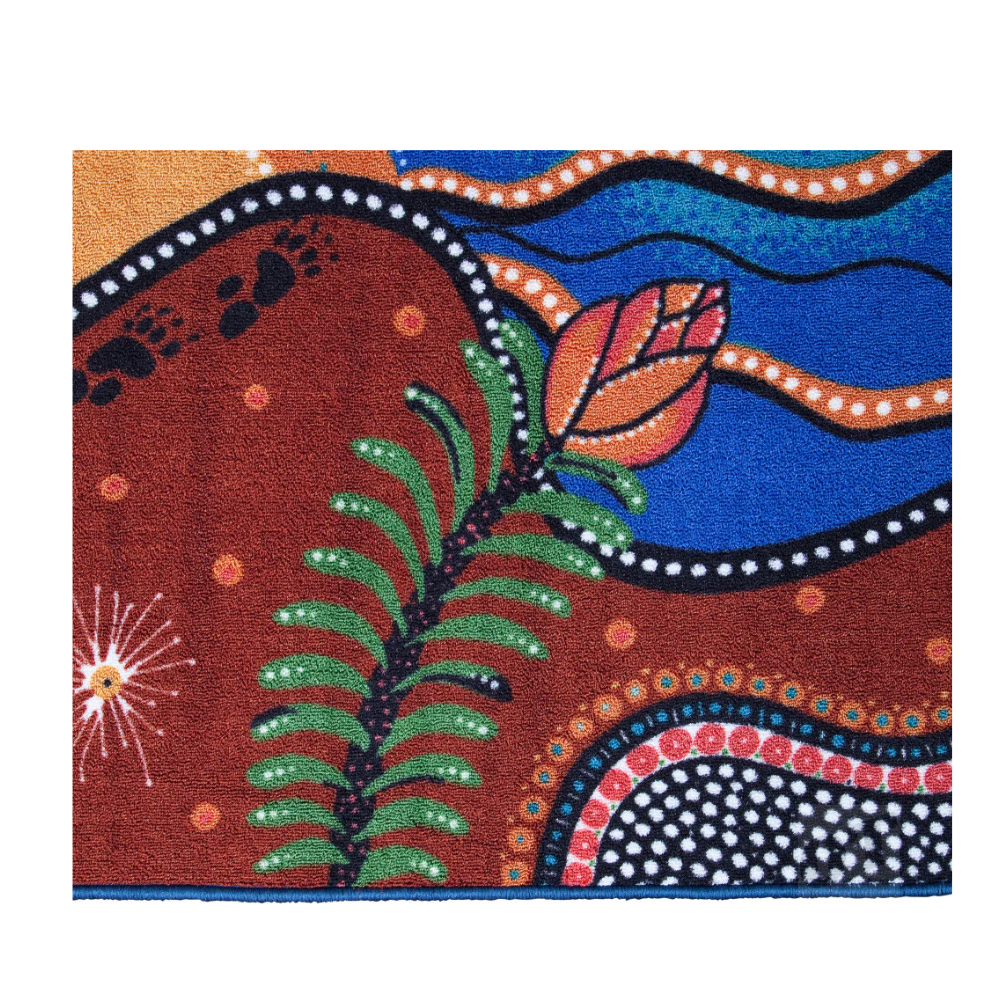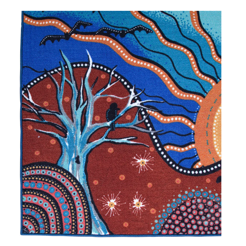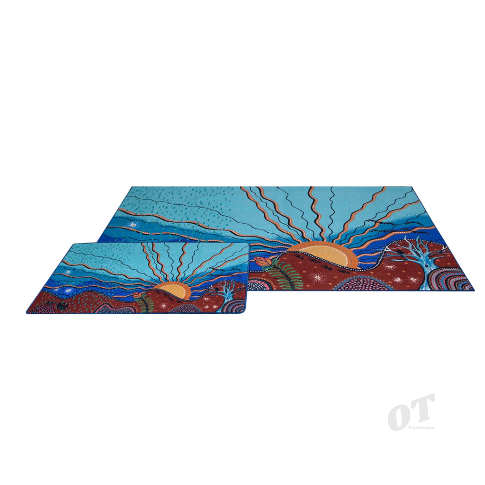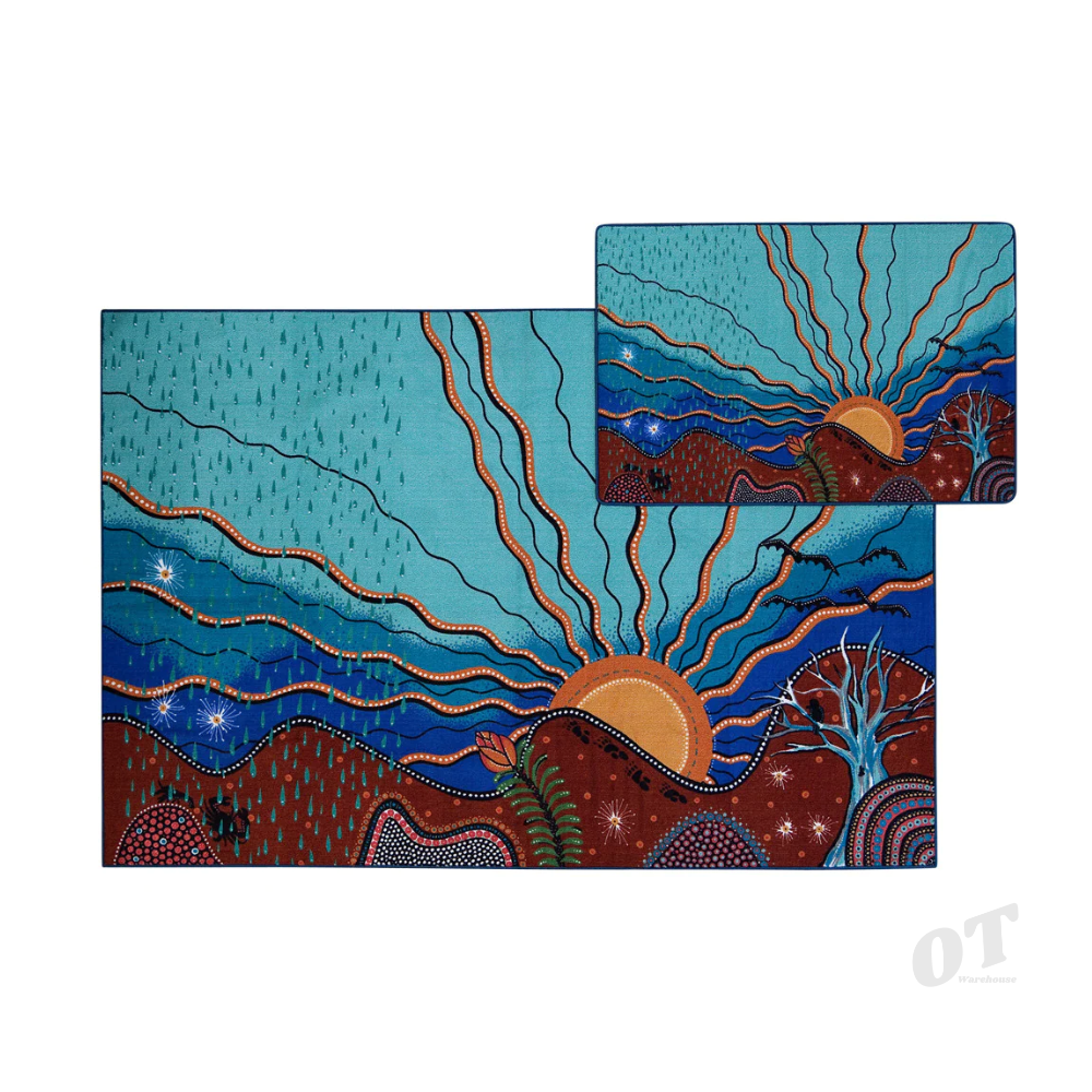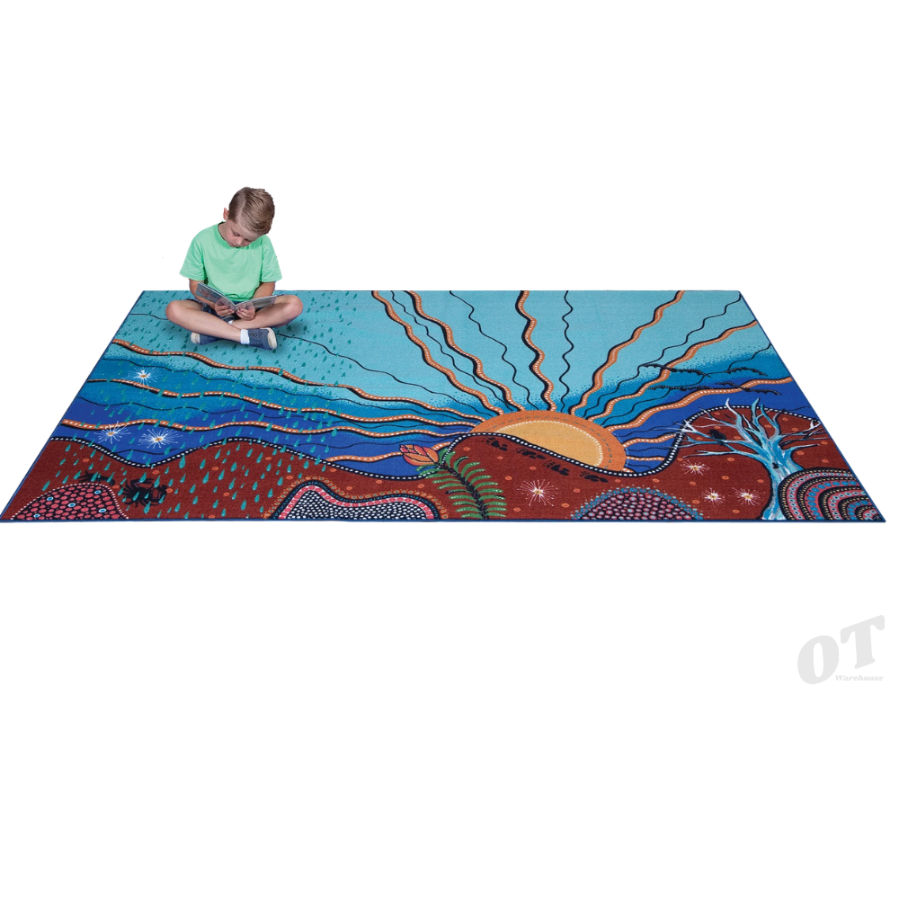 The Seasons Classroom Rug is a unique collaboration between First Nation artist DJ Mate and Elizabeth Richards. A truly beautiful classroom rug that gives kids space to ask questions, listen to stories and learn about Country.
