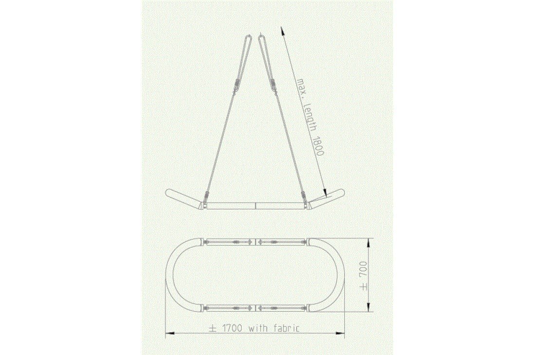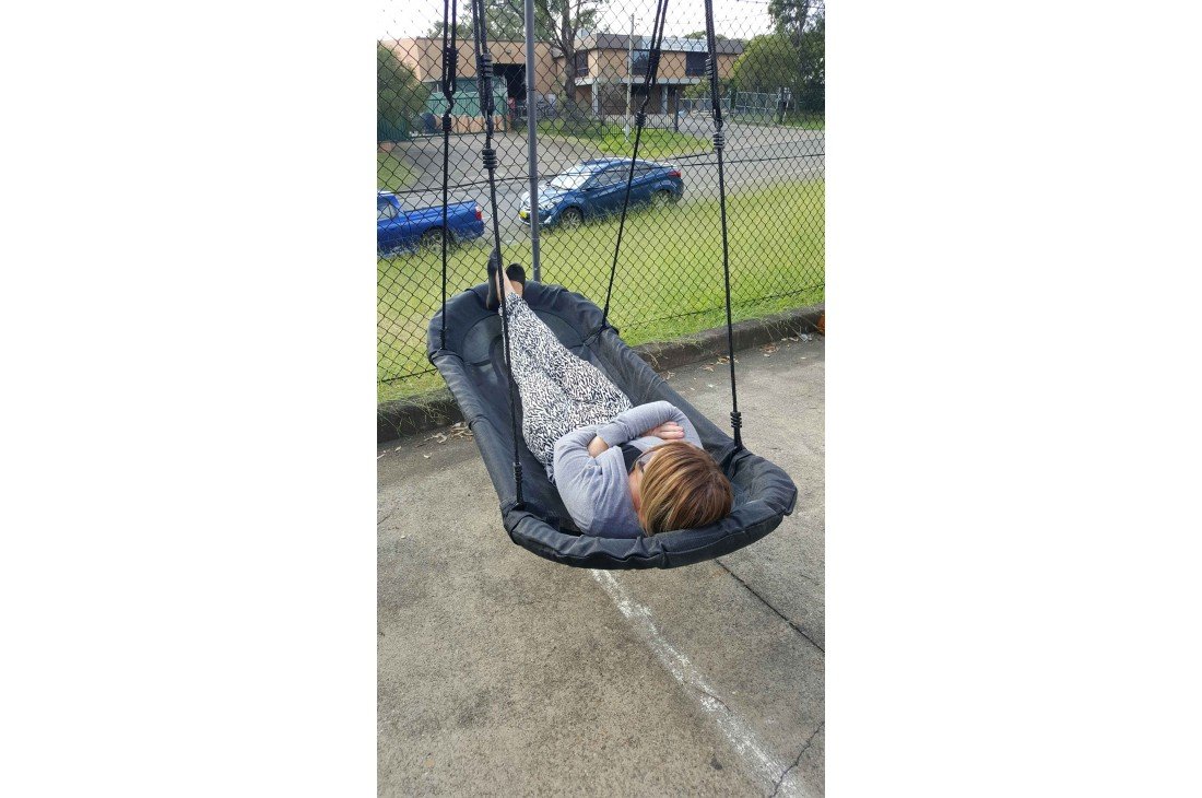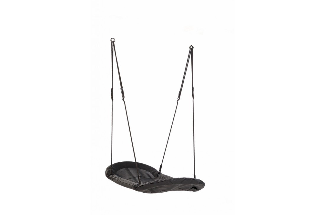 The KBT nest swing 'grandoh' is delivered flat-packed in a cardboard box and is easily assembled. The black braided ropes are easy to adjust in length. The steel frame is padded all around to ensure a soft impact. The fabric material is both strong and comfortable to the touch. Water can pass through it easily. The rings and eights are made in galvanised steel. The welds on the ropes are made in black PP. The extra-large seating area creates the impression of being in a rocking boat which adds to the fun. This swing can be used as a Hammock.