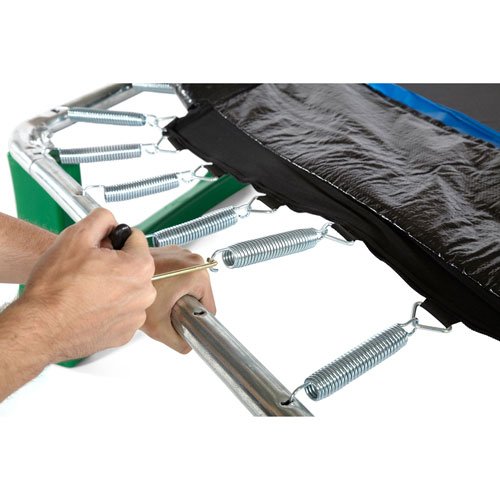 The thick safety padding is sewn to the jumping mat using a strong elastic webbing, giving no access to the mechanics of the trampoline.