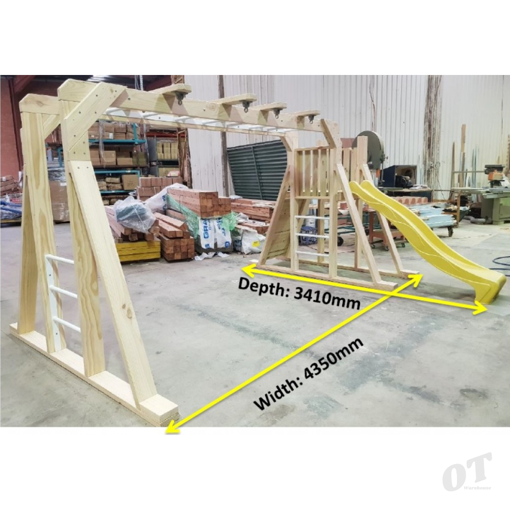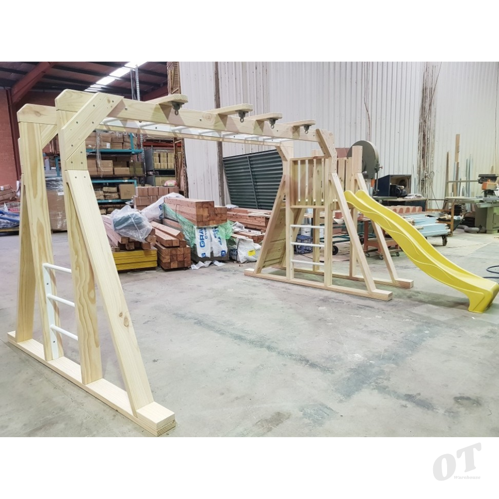 Swinging, climbing and sliding down a slide is more than just play for children living with sensory processing issues and special needs. The Sensory play Gym has been designed to bring the therapy home so you can continue vestibular activities under your own roof and available to use 24/7. The Sensory therapy Gym is a free-standing, multi-purpose play unit that includes monkey bars and wood beams with swing hooks above the monkey bar to allow different swings and attachments, like therapy swings to be easily attached on or off the unit.