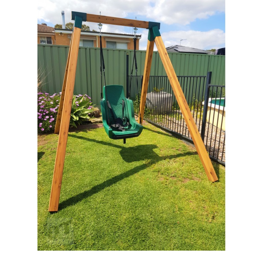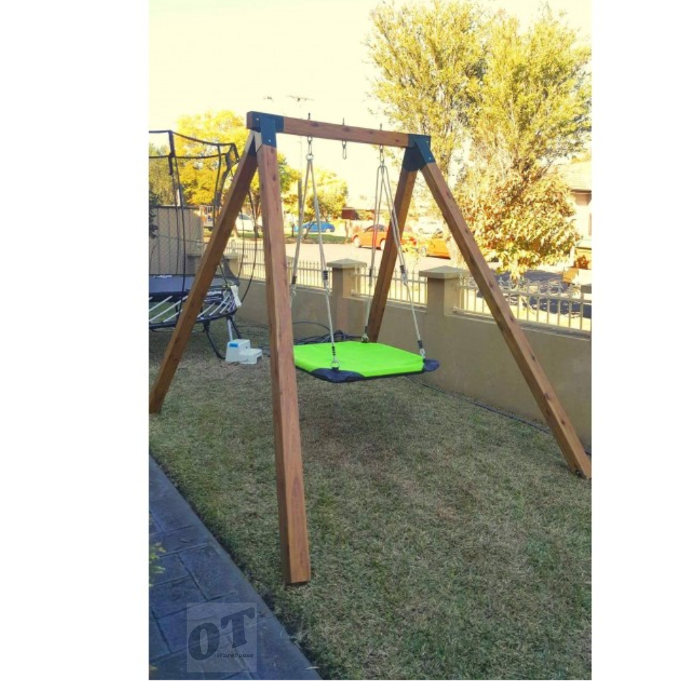 The Swing Sets includes swing hangers, hardware, ground anchors, cypress pine top beam and legs. Metal Oblique Swing corners are included.