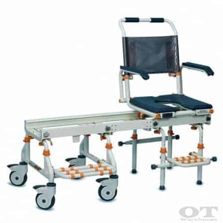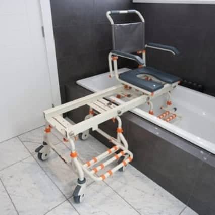 The Tub Buddy is an ergonomic bathing transfer system designed to allow the user to safely transfer over a bath tub without committing to any costly bathroom remodeling. The Tub Buddy is also capable of rolling over standard and elongated toilets to be used as a commode.